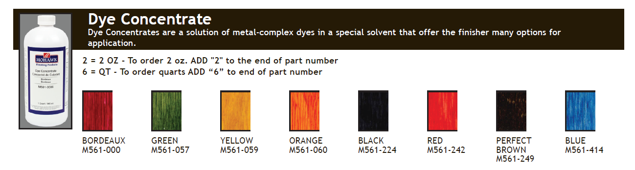 Mohawk Dye Concentrates are a solution of metal-complex dyes in a special solvent that offer the finisher many options for application. The Mohawk Dye Concentrates are designed to be let down with water for an economical, nonflammable stain or with alcohol and/or acetone for a fast drying, non-grain raising stain. They can also be used as a toner or “shader” by adding directly to water-based and most solvent based finishes to create a customized finish.