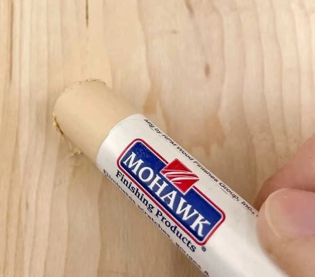 Just simply rub the wax stick in damaged areas to fill and scrape remaining product off using a credit card to leave an even, leveled surface. Works well on most wooden surfaces in low traffic areas.