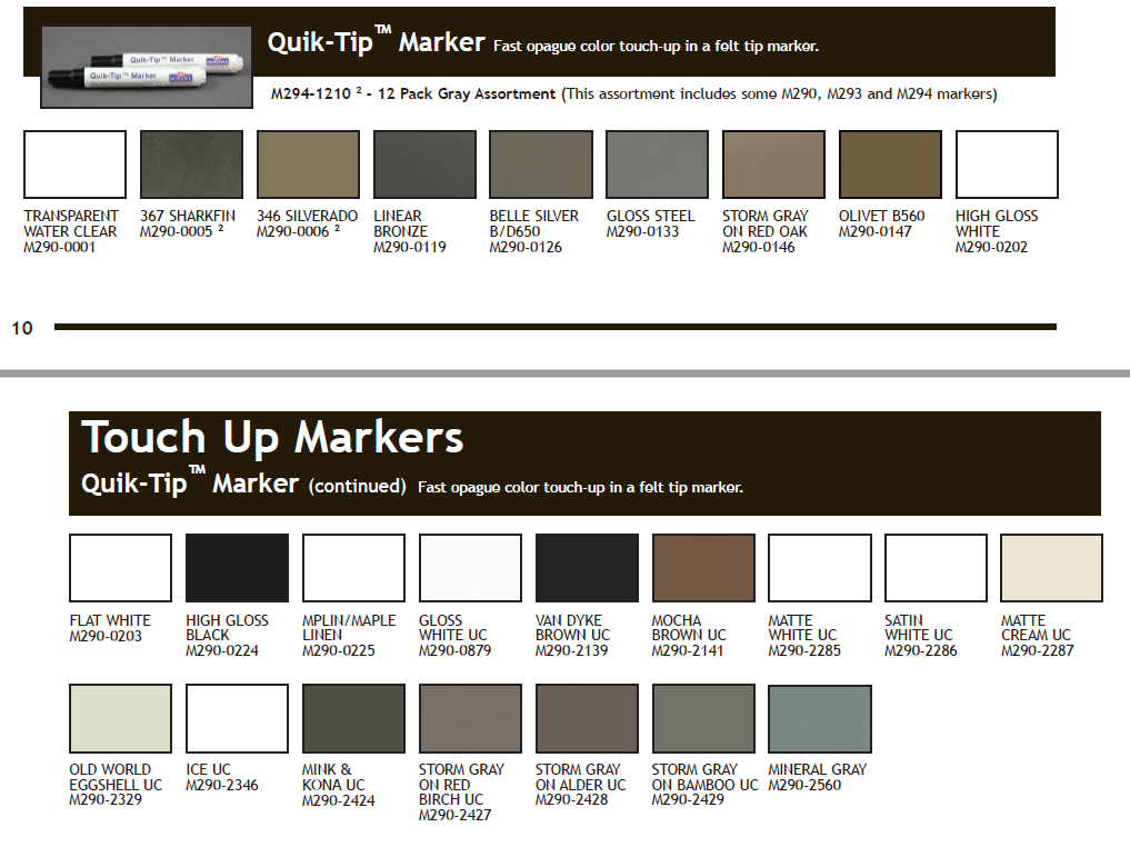 Mohawk’s “Quik-Tip” Marker applies a durable finish, solid color touch-up and repair in one easy operations. This marker provides excellent adhesion and wear.