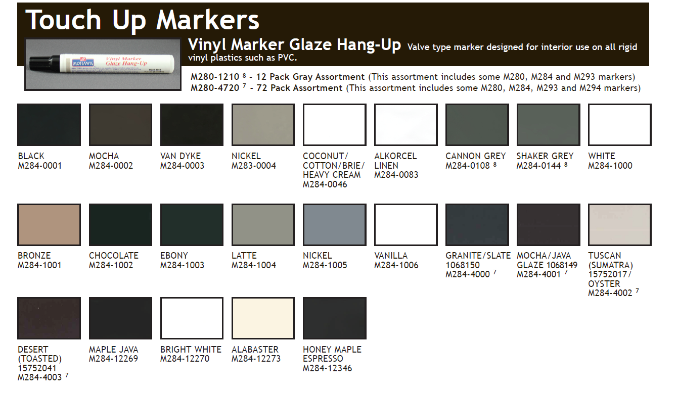 This valve-type marker, which provides fluid control to prevent overflowing and running, is designed for interior use on all rigid vinyl plastics such as PVC. Adheres where other markers fail. Fast drying, low solids, good hiding power, and resistant to common household cleaners, including ammonia and alcohol. Highly opaque when dried with tough and flexible properties.